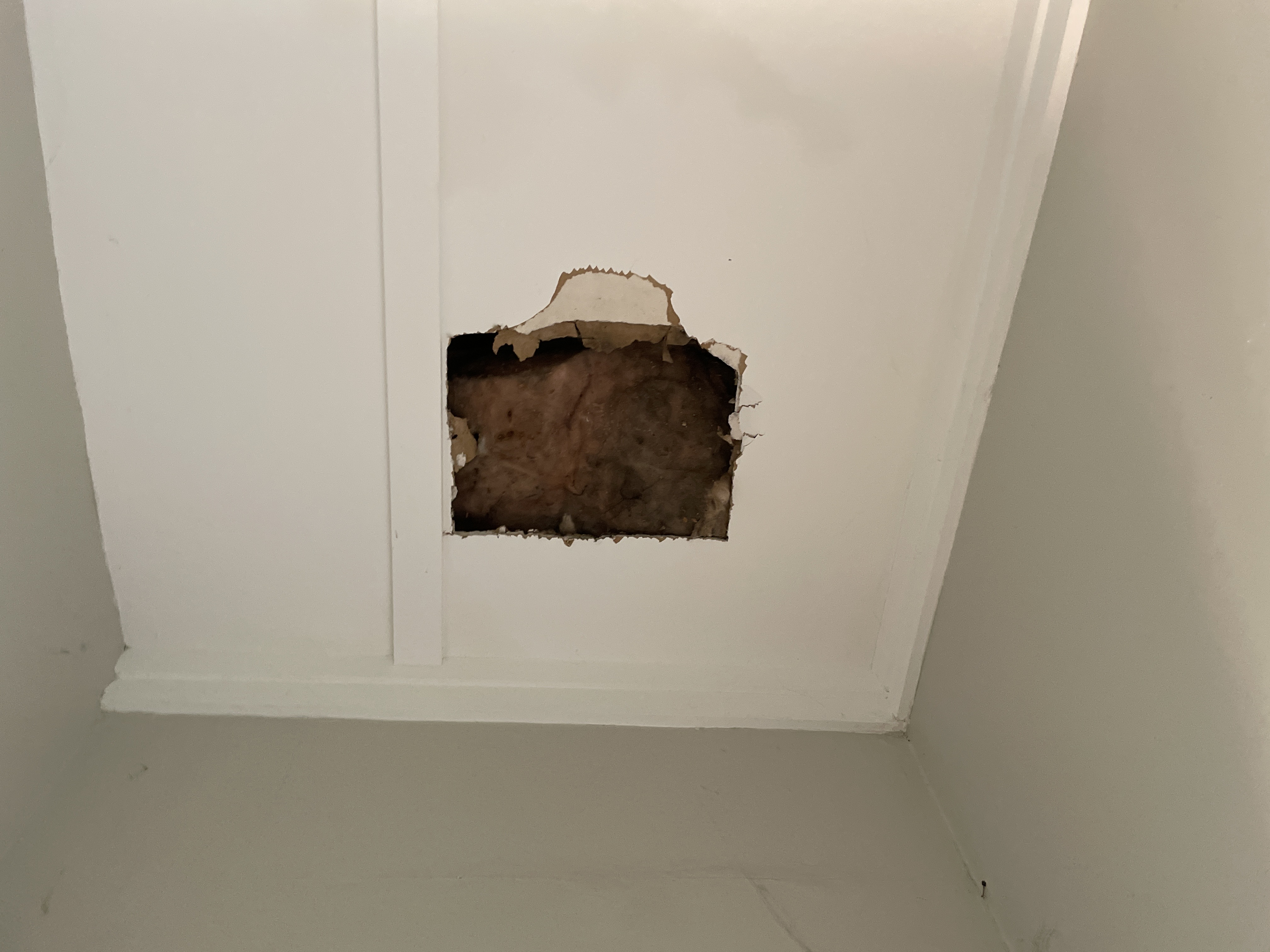 On 2025/09/04 we noticed a leak in our hallway ceiling. After contacting our property manager, a plumber was sent out and had to cut a large hole in the ceiling to fix the leak. We were informed that the water coming through our ceiling was shower water from the upstairs flat. The hole in the ceiling revealed Pink Batts that was an ugly shade of brown. We were assured that this hole would be patched up after the insulation had dried out.